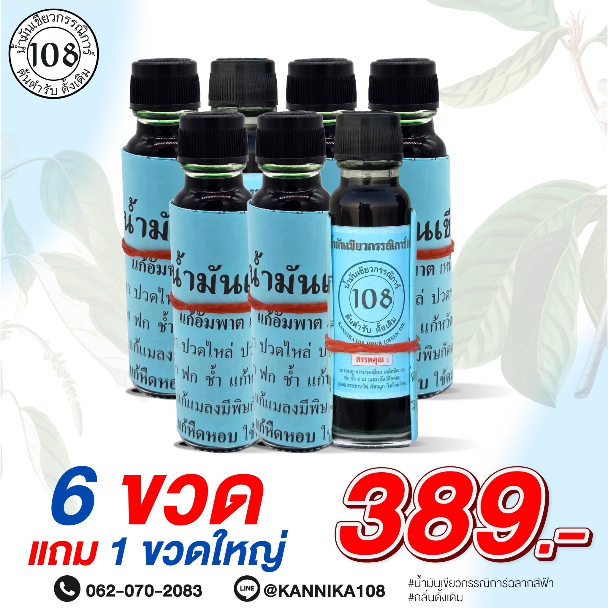 ชื่อ: น้ำมันเขียวกรรณิการ์ต้นตำรับดั้งเดิม ชุด (6ขวดใหญ่ แถม 1 ขวดใหญ่) 389.-