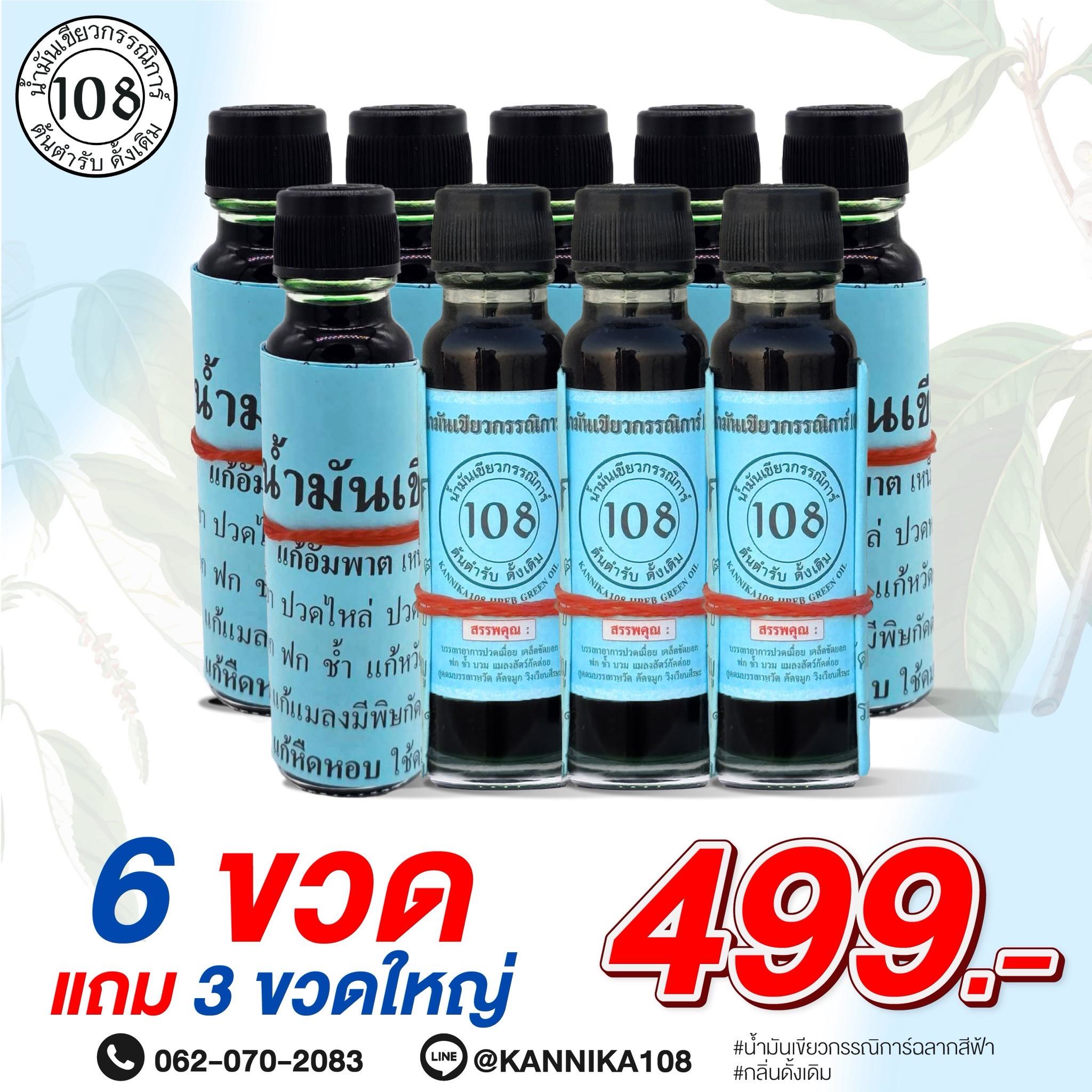 ชื่อ: น้ำมันเขียวกรรณิการ์ต้นตำรับดั้งเดิม ชุด (6ขวดใหญ่ แถม 3 ขวดใหญ่) 499.-